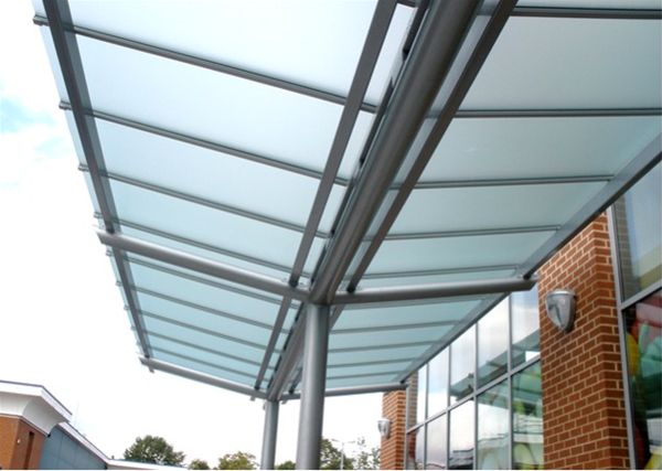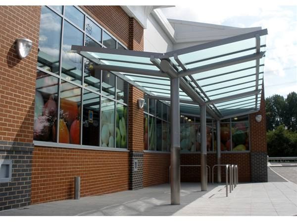 A mild steel decorated framework in an exterior grade heavy duty enamel high gloss paint system using RAL 9007 Metallic paint finish to replicate a steel surface. Support columns had stainless steel trolley impact protectors fixed to the bottom 1mtr section. The roof area was formed using a covering of satinised toughened safety glass held in place using a polyester powder coated aluminium glazing bar system. An integral aluminium valley gutter channel with appropriate down pipes completed the design. Cycle storage was provided in the form of matching free standing galvanised inverted U Sheffield style cycle hoops.