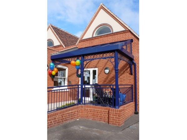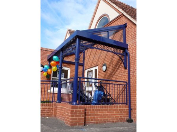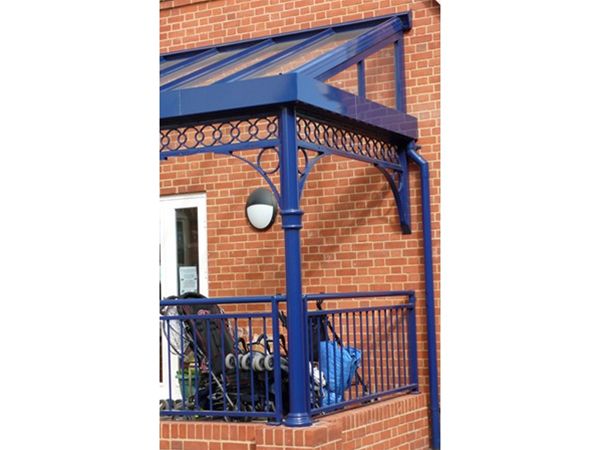 A mild steel decorated framework in an exterior grade heavy duty enamel high gloss paint system. Decoration was added to the steel support frame by the use of aluminium capital and circular frieze sections. The roof area was formed using a covering of clear toughened safety glass held in place using a polyester powder coated aluminium glazing bar system. End panels of the roof area were glazed with vertical glazing screens. An integral front aluminium gutter channel completed the design.