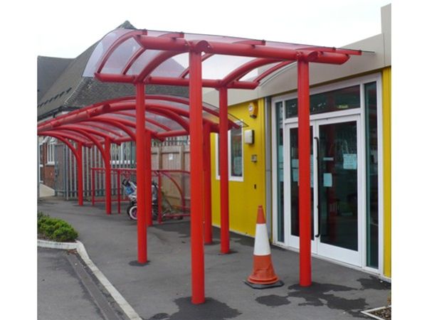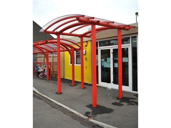 A mild steel decorated framework in an exterior grade heavy duty enamel high gloss paint system. Support columns were taken below ground for bolting to concrete slab foundations. The curved roof was formed using rolled steel members with a covering of solid polycarbonate clear sheeting panels secured using aluminium glazing straps and neoprene seals for a watertight roof area.