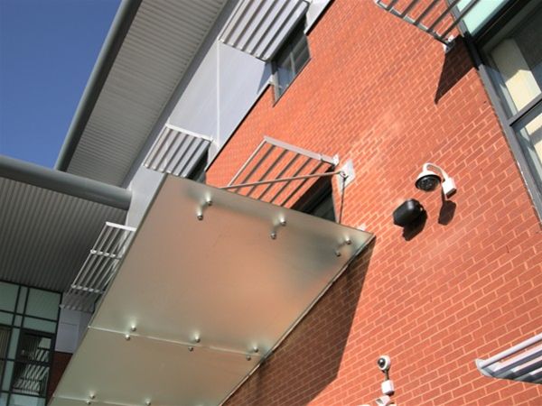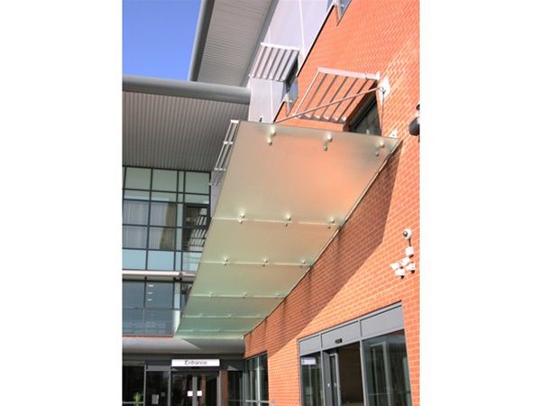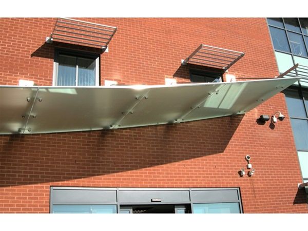 The feature is formed by the use of a minimal steel frame and 25mm thick toughened satinised safety glass panels which are flat but laid in a faceted manner to provide a graduated curved canopy creating the main entrance focal point. Further structural support is provided by the use tension rod supports fixed to the front edge of the canopy and to the structure at a higher level.