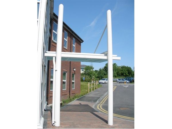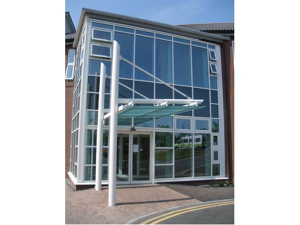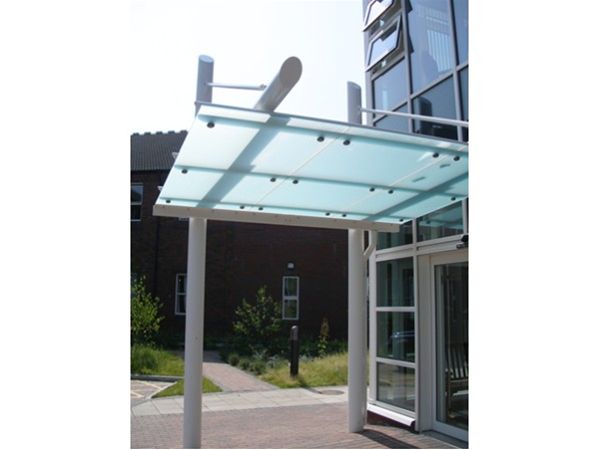 A free standing decorated mild steel entrance feature, highlighting the small door way to the hospital. The framework is formed using fully decorated mild steel with CHS support columns taken to concrete foundation bases below ground level. Extra stability is provided by the use of tension rods fixed to the front edge of the glazed area and to the support columns at a higher level. Glazing is by the use of satinised panels of toughened safety glass securely fixed in a planar type system. A rear integral gutter channel with drainage taken down the main support columns completed the design.
