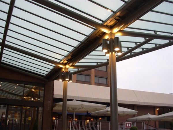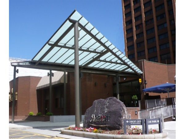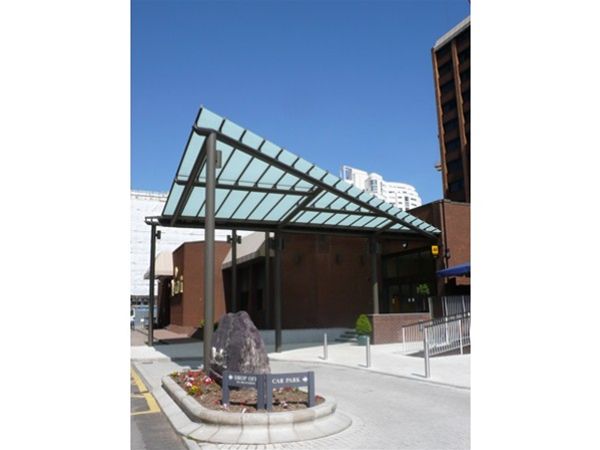 The main focal point of the entrance to a town centre hotel in Cardiff. The V shaped framework is formed using fully decorated mild steel with heavy duty CHS support columns taken to concrete foundation bases below ground level. Glazing is by the use of satinised panels of toughened safety glass securely fixed in a polyester powder coated aluminium patent glazing bar system. An integral valley gutter channel with drainage taken down the main support columns completed the design.