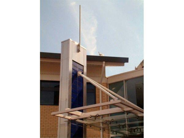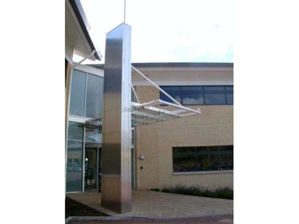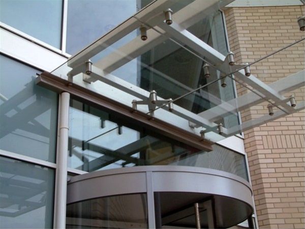 A free standing entrance feature created with a rear support column of tiled and clad steel framing, with supports taken to large concrete foundations below ground level. Glazing cantilevering from the support was formed by the use of clear panels of clear toughened safety glass fixed to the underside of the steel frame using a stainless steel planar type system. Tie rods provided the extra stability required for the structure. All steel work was decorated using a heavy duty exterior grade finish enamel paint system.