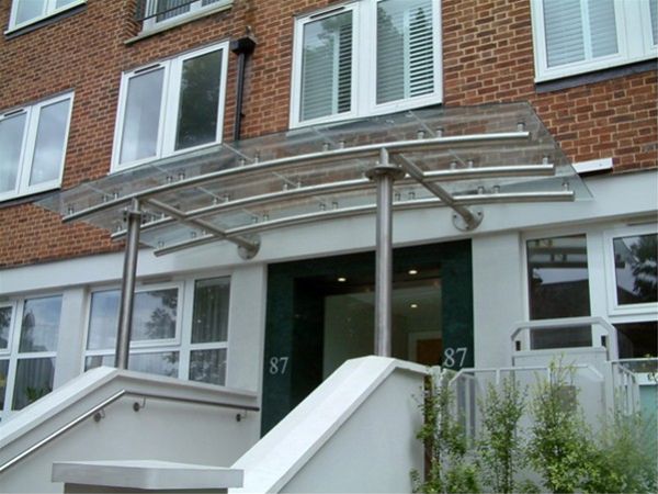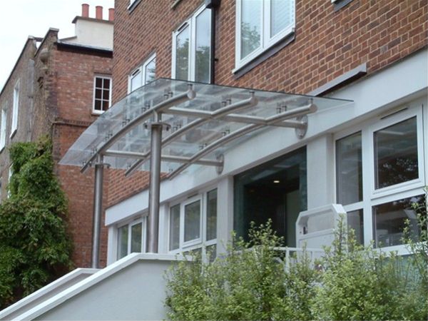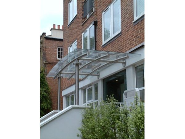 A full stainless steel support frame fixed to front dwarf support walls and to the main structure with resin anchor fixings. Glazing was provided by clear toughened safety glass panels which were flat but laid on the curve of the rolled roof members to create the illusion of curvature. Panels were fixed using a stainless steel planar type fixing system.