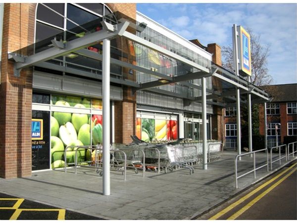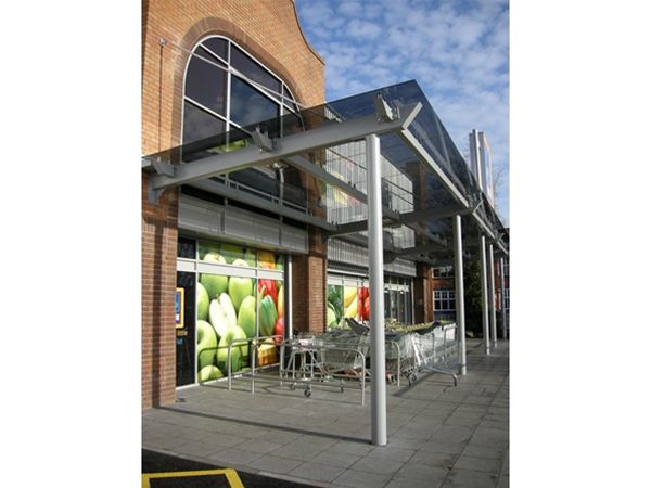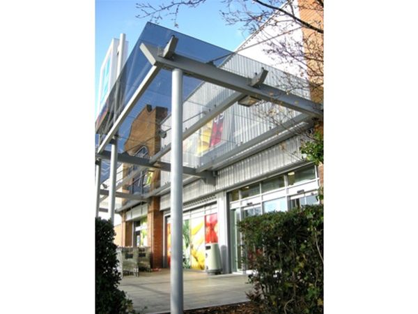 The free standing entrance feature to the supermarket was created using a mono pitch mild steel framework with heavy duty CHS column supports taken to large concrete foundation bases below ground level, extra horizontal supports were taken back to the main structure framework. Glazing panels of anti sun grey toughened safety glass material were supported from the steel frame by the use of stainless steel planar type fixings. Tension rod supports were fixed to the front edge of the canopy and back to the structure at a higher level. Gutters and down pipes were provided to the rear of the feature. All steel work was fully decorated using a heavy duty exterior grade metallic paint system.