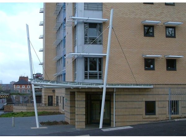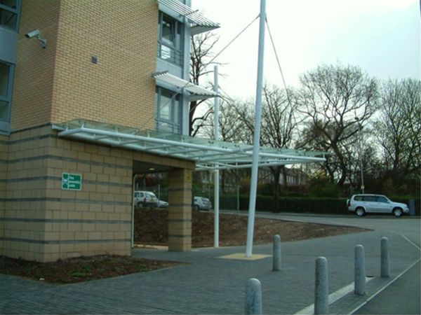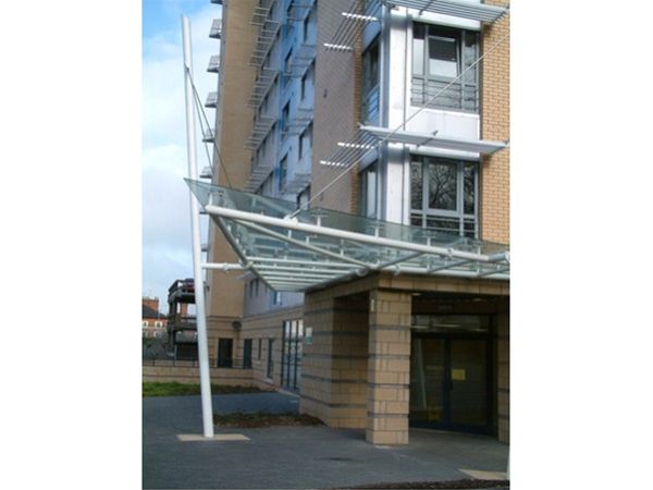 A unique decorated nautical theme mild steel free standing supported feature structure with 2 main support columns taken down to concrete foundation bases below ground level and extra horizontal supports fixed back to the main structure. The roof area is covered by panels of clear toughened safety glass panels fixed to the steel framework using a stainless steel planar type fixing system. Further structural support is provided by the use of tension rod supports. All steel work decorated in a heavy duty exterior grade high gloss enamel paint system.
