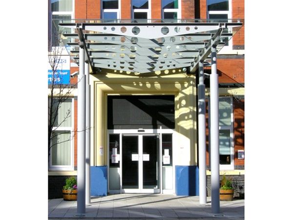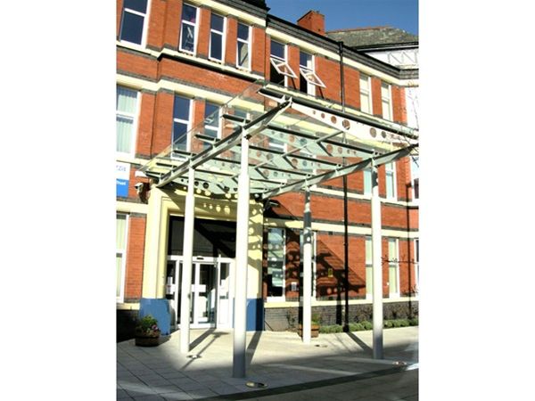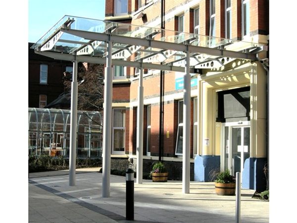 A striking entrance feature created using a decorated mild steel support framework with laser profiled cross members and fully glazed roof area. Glass panels were of clear toughened safety glass fixed securely in a stainless steel planar type glazing arrangement. All steel work was decorated using our standard heavy duty exterior grade enamel paint system.
