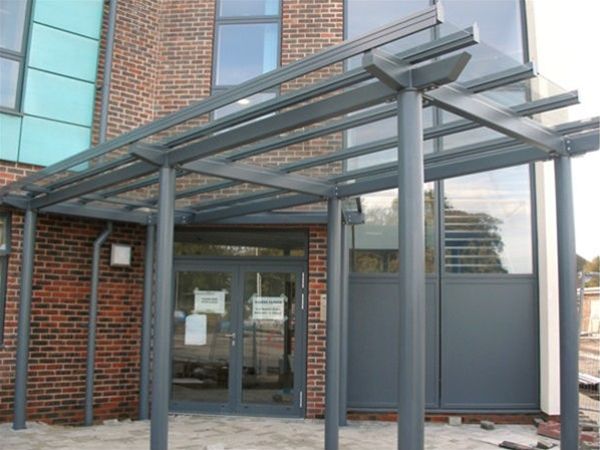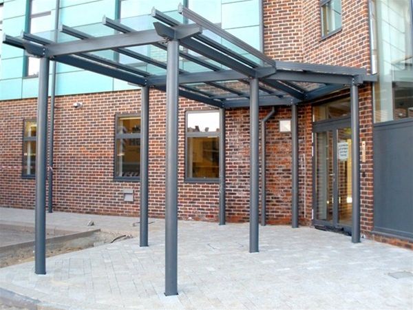 A feature entrance canopy fabricated from mild steel, decorated with our heavy duty exterior grade paint system and with a roof covering of toughened safety glass panels, fixed in a polyester powder coated aluminium glazing bar system. Rear gutters and down pipes completed the design.