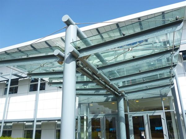 A gull wing style canopy fabricated with a mild steel frame, support columns and profiled T section support arms. Glazing was by the use of clear toughened safety glass panels held in place using stainless steel planar type fixing supports. The front running edges of the projecting arms were tied back to the main support steel by the use of stainless steel tension rod wires and couplers. Running down the central spine of the gull wing is an integral polyester powder coated gutter channel with suitable downpipes.