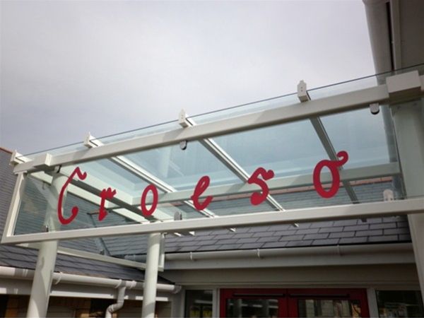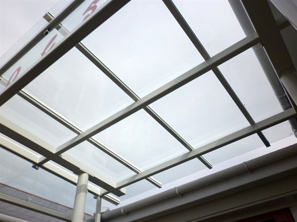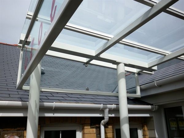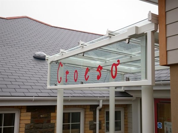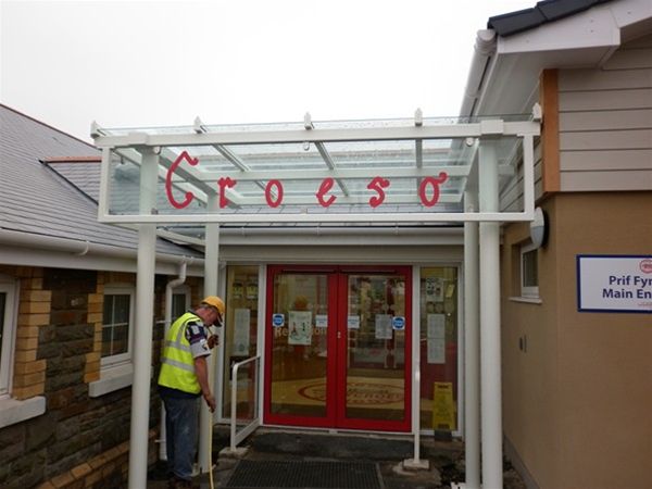 A fully supported glass canopy with clear toughened safety glass roof panels held in a patent glazed aluminium roofing system. The client was concerned that the height of the canopy would allow high levels of wind to go under the canopy so the design incorporated vertical high level side screens of 12mm toughened safety glass which were used to incorporate integral vinyl signage for the school entrance. The entire structure was decorated using our heavy duty exterior grade paint system.
