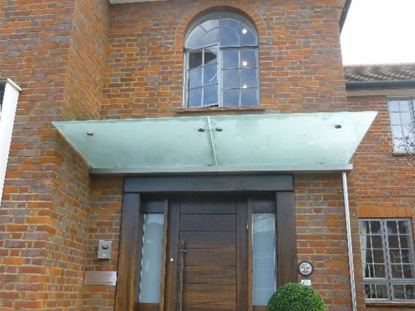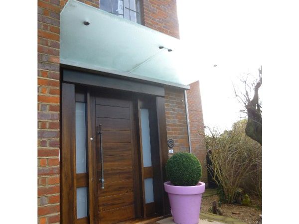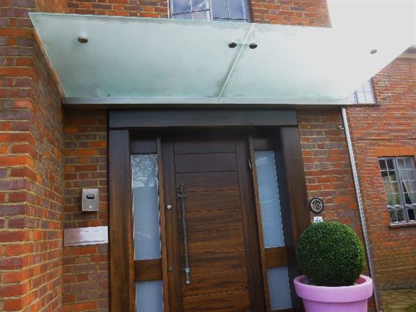 A simple but effective entrance canopy, comprising of satinised toughened safety glass on planar type fixings and supported by a fully fabricated stainless steel framework, including stainless steel gutter channel and down-pipe.