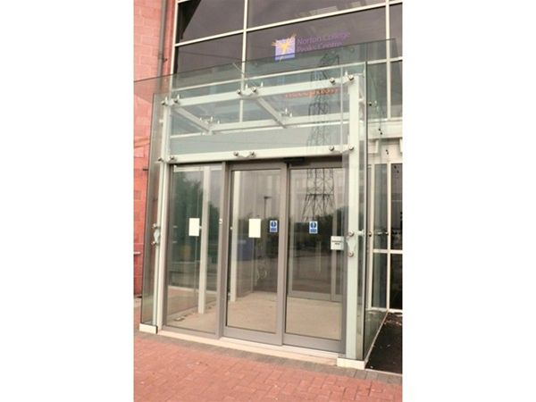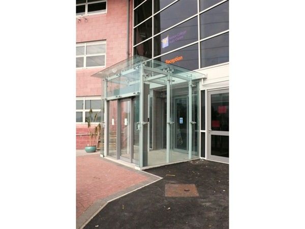 A glass entrance kiosk created using a full internal skeleton sub framework of decorated mild steel members with roof and vertical panels of clear toughened safety glass, stainless steel planar type fixings and exterior fascias, trims, gutters and down pipes. All interior metalwork was fully decorated using a high build enamel paint system and all joints between glazing were sealed using a clear Dow Corning silicon sealant. The glass kiosk provided a unique feature on the main entrance to a college building in Sheffield.