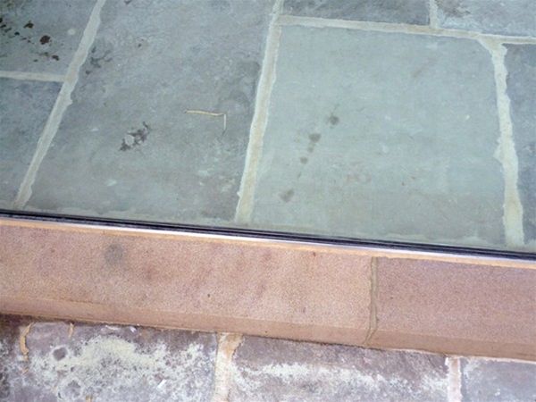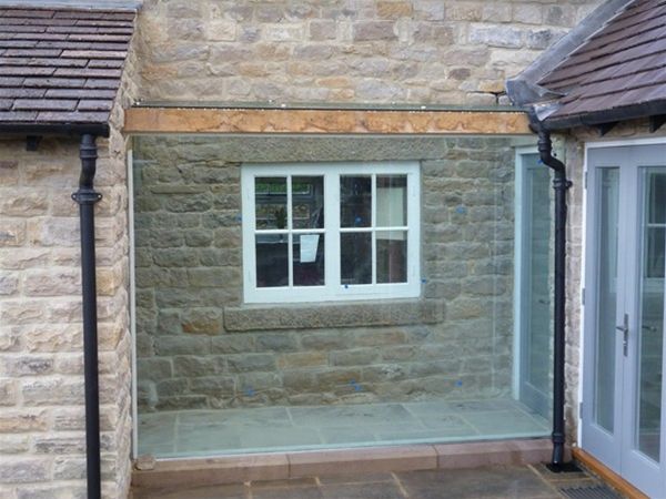 Creating a covered link between two buildings Urban Design provided oversize toughened safety glass panels for both a vertical front screen and a horizontal roof screen. The glass panels were of toughened safety glass. Whilst the link had limited thermal property values the essential design brief was to create a watertight area between the structures allowing the maximum amount of light and minimal (preferably none) steel work. With stone cills providing a secure locking system the installation was completed ahead of schedule for the client to use the glass panels as a canvas for murals at a later date.