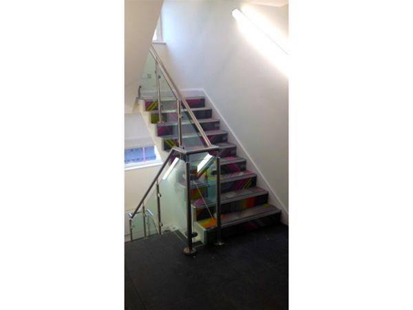 Urban Design were asked to design and install a new handrail and balustrading system for Bandai Namco in London. This was constructed of 304 stainless steel Q rail push fit system with CHS posts and handrails. The glass was 10mm polished, clear toughened safety glass that was fixed between the posts using our standard stainless steel glass clamps.