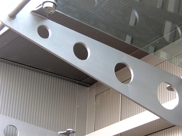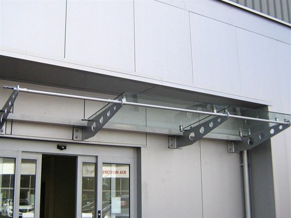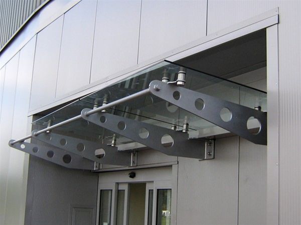 A suspended decorated mild steel canopy unit comprising of projecting arms laser cut plates with shaped ends which were bolted back to a rear running channel section. Glass panels of clear toughened safety glass were supported above the projecting arms by the use of stainless steel planar type fixings. The projecting arms were fixed together by the use of a chs tubular member to prevent any lateral movement. The canopy was completed by the inclusion of a rear gutter channel and suitable downpipes.