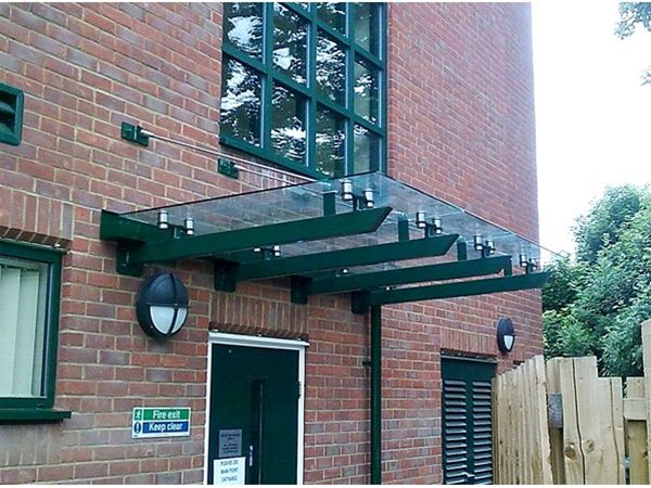 A fully decorated mild steel support framework with laser profiled projecting arms, fixed back to internal steelwork provided the basic design for this attractive individual glass canopy unit. Stainless Steel support tension rods gave extra stability to the design. All steelwork was fully decorated using our standard heavy duty exterior grade enamel paint system, which is available in any standard BS or RAL colour. Roof covering to the glass canopy unit was provided by the use of clear toughened safety glass panels fixed in a stainless steel planar type system. An Integral rear gutter system with an external down pipe completed the simple but effective glass canopy unit design.