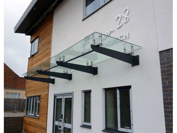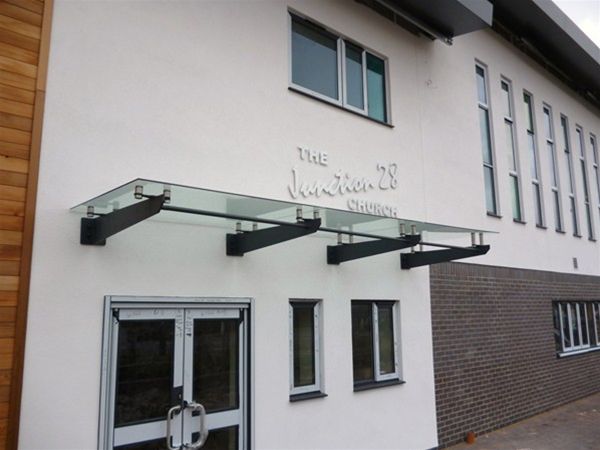 A suspended decorated mild steel glazed canopy unit comprising of projecting arms laser cut plates with shaped ends which were bolted back to a internal steel horizontal beam. Glass panels of clear toughened safety glass were supported above the projecting arms by the use of stainless steel planar type fixings. The glass roof panels were inclined forward to allow rain water to disperse and reduce the need for any drainage systems on the canopy.