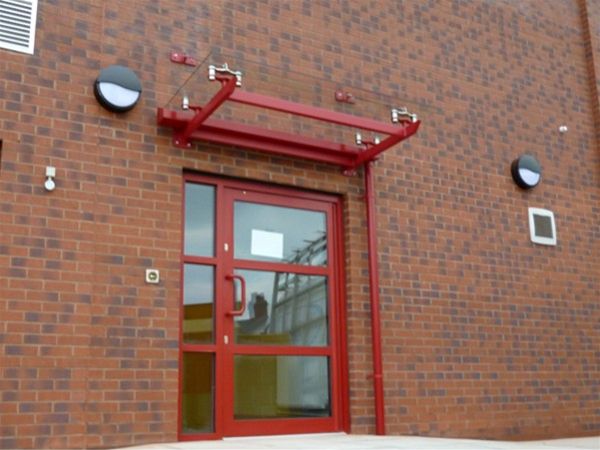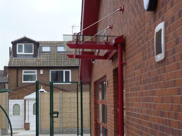 A simple but effective entrance feature comprising of a decorated mild steel support frame which was bolted back to the existing building face, with extra support created by the use of two stainless steel tension rods. A rear gutter and single down-pipe outlet completed the design.