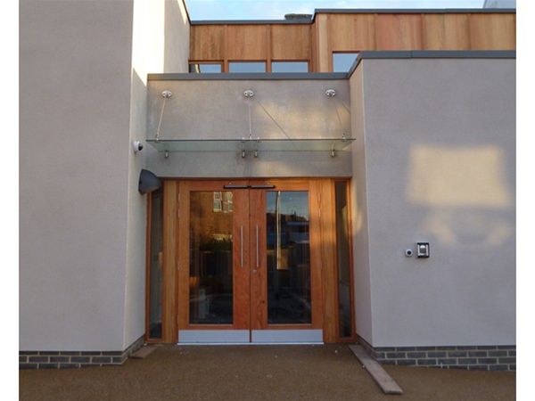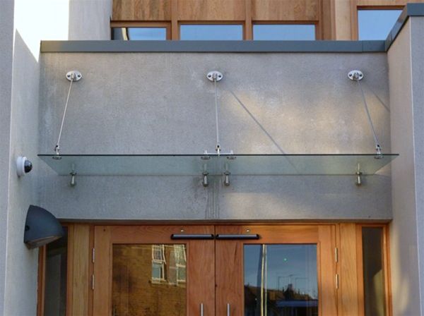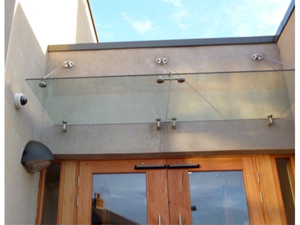 A frameless glass canopy provided by Urban Design for an hospital office in Wakefield comprising of toughened clear safety glass panels fixed using only minimal stainless steel support tie rods and rear fixing bolt stubs. The canopy sloped slightly forward to avoid the need for any rear drainage system. This type of canopy can provide an economical solution for any area but care must be taken over the span and projection of the glazed area. For technical assistance or to see if this style is right for you please contact our sales department.
