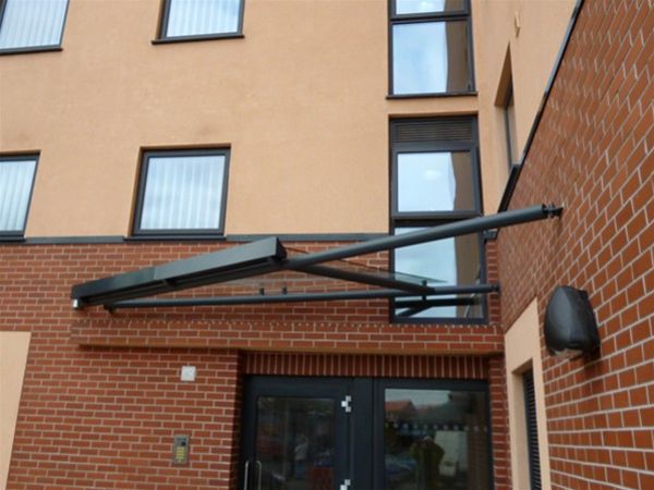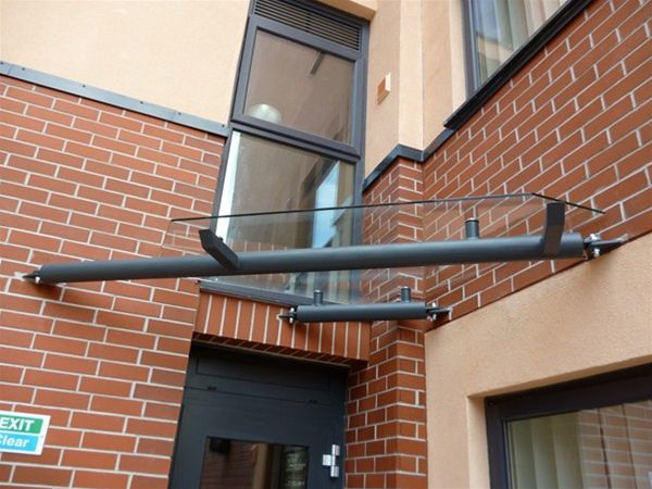 A fully suspended glazed canopy unit with steel supports built into the side brickwork walls. Glazing was by the use of clear toughened safety glass panels held in a stainless steel planar type arrangement. There were no gutters or drainage to the canopy. The design provided a unique style of entrance feature to a development in Eccles, Manchester for the client.