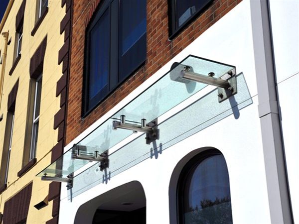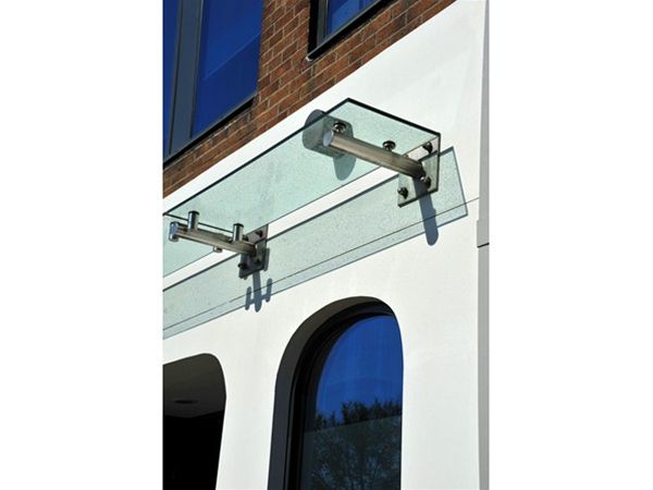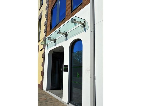 A full stainless steel CHS support frame with stainless steel planar type glass support fittings. Glass panels were of clear laminate toughened material. Fixed through front plates on the outer wall to the main internal steelwork using stub brackets to give the required support. The small but functional canopy provided a prestigious banks offices with an attractive entrance feature. There were no gutters or drainage provisions to the canopy.