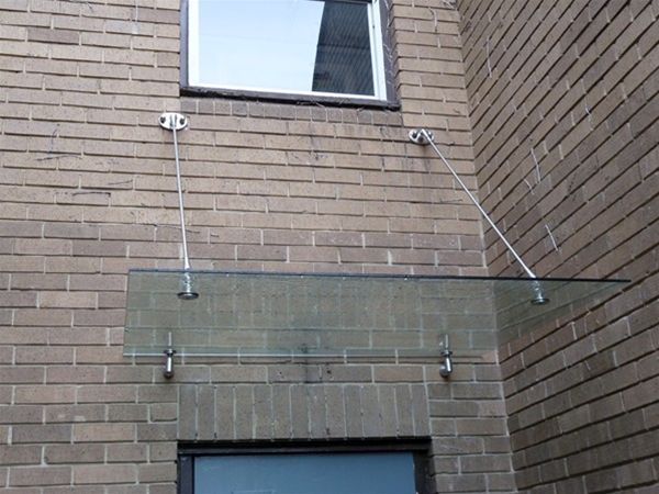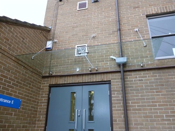 A series of frameless glass canopies provided by Urban Design for a hospital office in Wakefield comprising of toughened clear safety glass panels fixed using only minimal stainless steel support tie rods and rear fixing bolt stubs. The canopies sloped slightly forward to avoid the need for any rear drainage system. The scheme comprised of single panel and larger double panel canopies. This type of canopy can provide an economical solution for any area but care must be taken over the span and projection of the glazed area. For technical assistance or to see if this style is right for you please contact our sales department.