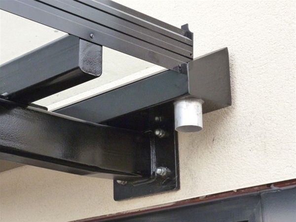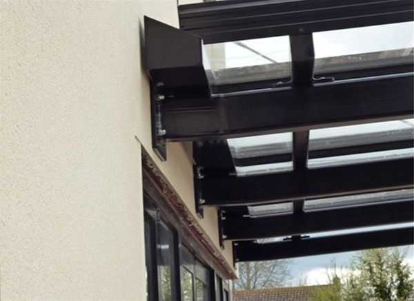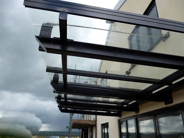 Comprising of Glass toughened safety glass panels held in a polyester powder coated aluminium patent glazing bar system fixed over a mild steel decorated sub frame fixed through stub brackets to the internal steel frame of the main structure. Extra stability was provided by the use of stainless steel tie rods fixed to the main structure at a higher level and to special raised steel brackets on the front edge of the canopy.