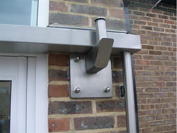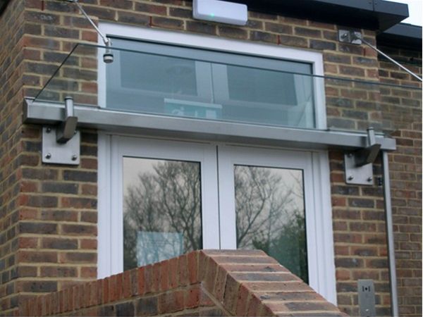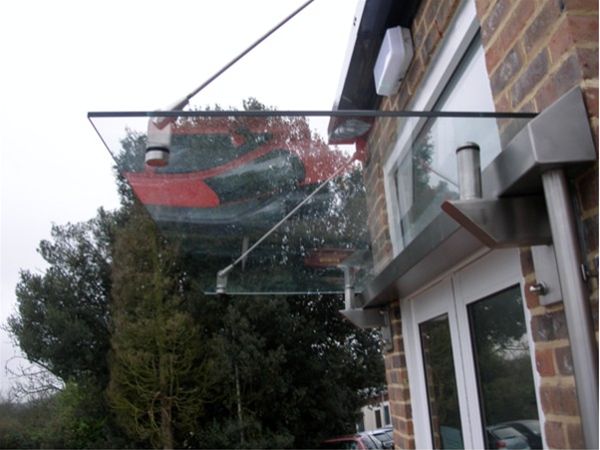 A simple frameless style glass canopy to an office development in Portsmouth. The rear gutter provided a feature for the canopy with extra oversize projecting stub brackets and stainless steel tension rod cables providing essential stability of the completed unit.