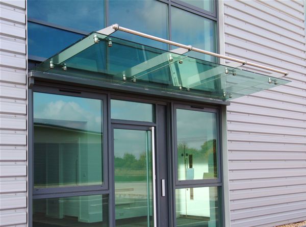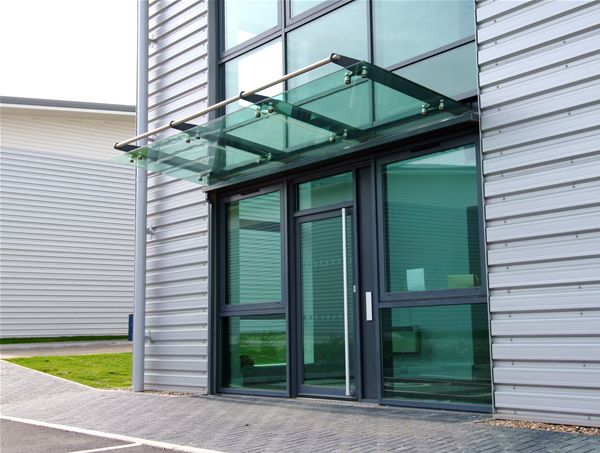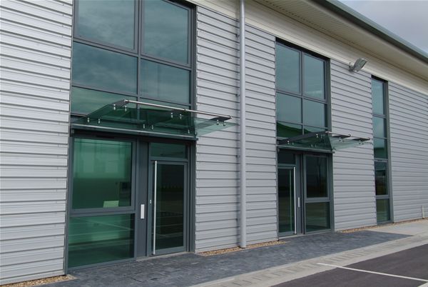 A decorated mild steel framework with a front runner rail of stainless steel, fixed back to a rear PFC channel section which was part of the main steel framework for the building. Glazing to the roof area was provided by using clear toughened safety glass panels securely fixed in a stainless steel planar type fixing arrangement. Glass panels were under slung to the roof frame. All steelwork decorated in a heavy duty exterior grade high gloss enamel paint system and the design was finished with a rear integral aluminium polyester powder coated box gutter channel.
