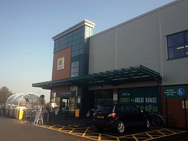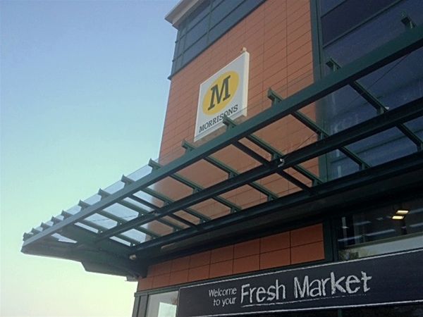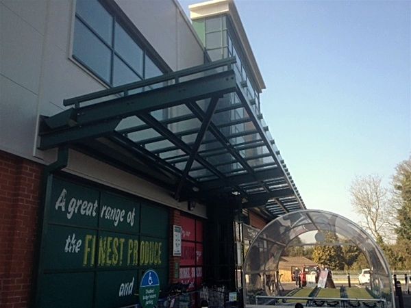 Working once again for a well known Supermarket chain Urban Design provided running glass canopy structures to many areas of the store, including the main entrance area. Combining polyester powder coated bespoke aluminium patent glazing bars and toughened safety glass panels, with all main and secondary steelwork the store was completed on schedule. All steelwork was decorated in the corporate colours using a heavy duty exterior grade paint system. Rear gutters compelted the design.