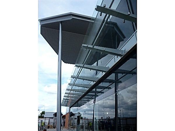 Urban Design provided on a retail park outlet in Bexhill a series of running fully fabricated decorated mild steel canopy structures. All canopies had laser profiled arms fixed back to internal steelwork (isolated using neoprene gaskets and seals to prevent bi metallic reactions) with an integral rear aluminium powder coated gutter channel system and suitable CHS down pipes. Glazing was provided by the use of clear toughened safety glass panels fixed in a stainless steel planar type system in a under slung arrangement to the main steel frame.