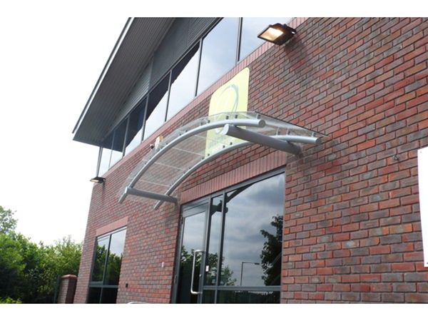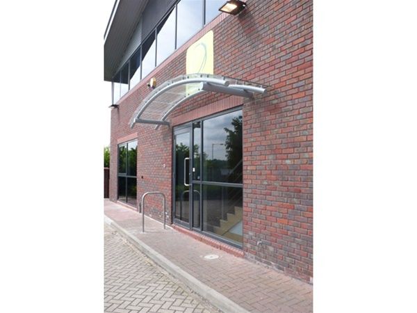 A full mild steel CHS support framework fixed securely to internal steel and fully decorated using a heavy duty exterior grade enamel high gloss paint system. Glazing to the roof area was provided by the use of flat toughened safety glass panels laid in a faceted arrangement around the curvature of the rolled steel roof members and which were securely fixed in place using stainless steel planar type fixing brackets.