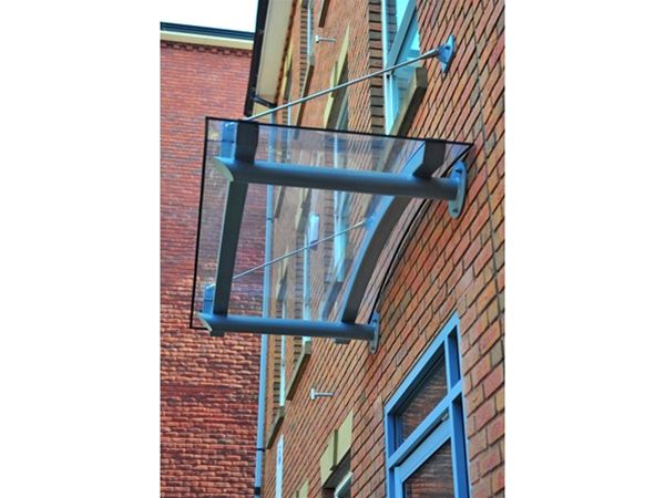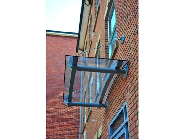 Comprising of a fully decorated mild steel framework, fixed back to internal steelwork by the use of stub bracketry and with tie rod tension supports. All steelwork was fully decorated using our standard heavy duty exterior grade enamel paint system, which is available in any standard BS or RAL colour. Roof covering was provided by the use of solid clear polycarbonate sheeting.