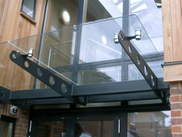 Decorated mild steel, laser profiled support arms carry a planar type glazing system with clear toughened safety glass panels. Arms were fixed back to a main horizontal support beam which in turn is connected back to internal steelwork. A internal rear gutter drainage system completed the design and the client chose a dark RAL colour to emphasise the framework.