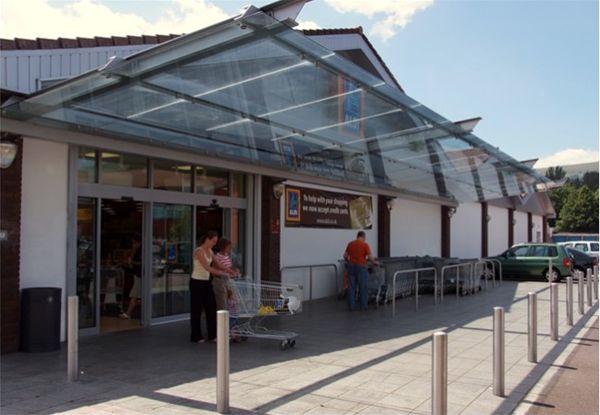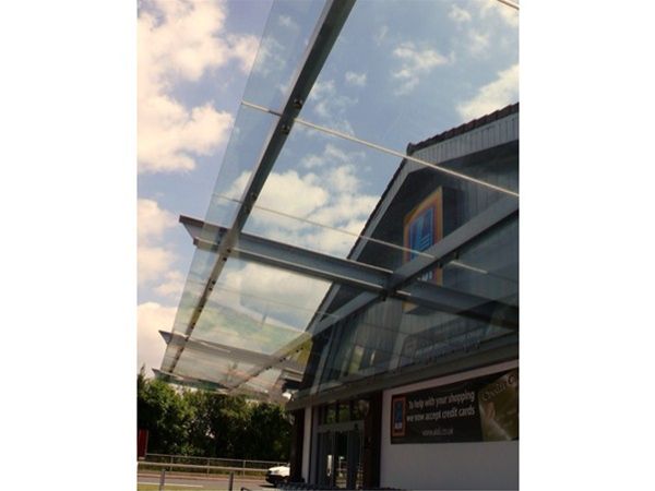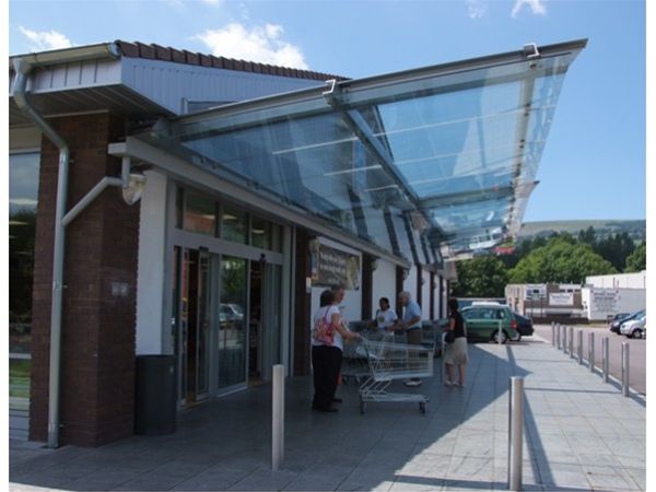 A fully decorated mild steel support framework fixed back to internal steelwork provided the basis of a large cantilever suspended canopy to the store frontage. All steelwork was fully decorated using our standard heavy duty exterior grade enamel paint system, which is available in any standard BS or RAL colour. Roof covering was provided by the use of clear toughened safety glass panels fixed in a stainless steel planar type system. Glass panels were under slung from the main framework. An integral rear gutter system with suitable down pipes completed the design.