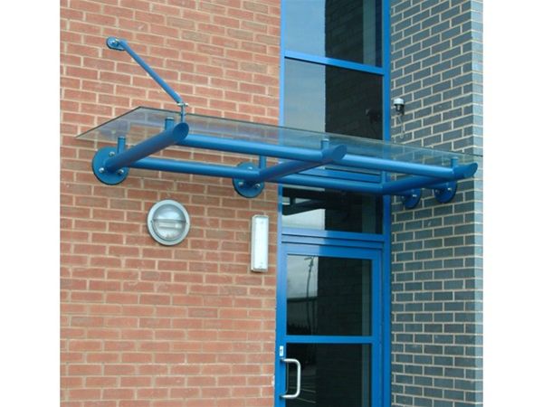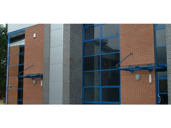 A fully decorated mild steel support framework fixed back to internal steel work provided a small cantilever style suspended canopy unit to a small office entrance. Extra stability was provided by the use of a single tension rod connector. All steel work was fully decorated using our standard heavy duty exterior grade enamel paint system, which is available in any standard BS or RAL colour. Roof covering was provided by the use of clear toughened safety glass panels fixed in a stainless steel planar type system.
