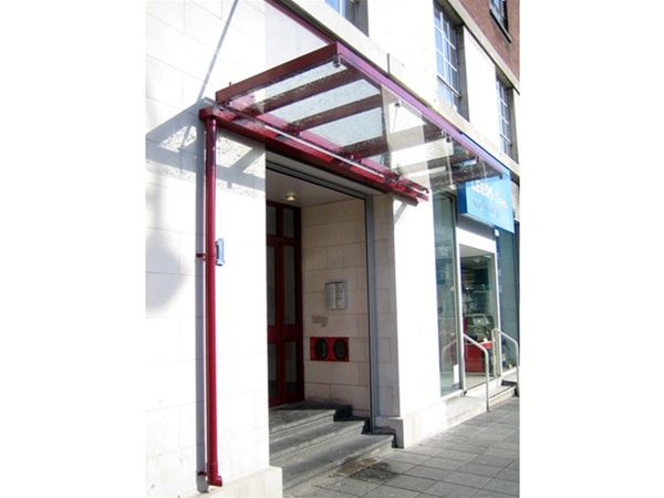 A fully decorated mild steel support framework fixed back to internal steelwork provided the basic design for this attractive individual canopy unit. Support tension rods gave extra stability to the design. All steelwork was fully decorated using our standard heavy duty exterior grade enamel paint system, which is available in any standard BS or RAL colour. Roof covering was provided by the use of clear toughened safety glass panels fixed in a stainless steel planar type system and glass panels were under slung from the main framework. Integral rear gutter system with suitable down pipe completed the design.