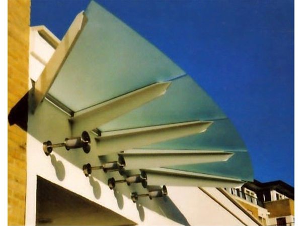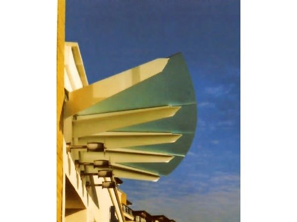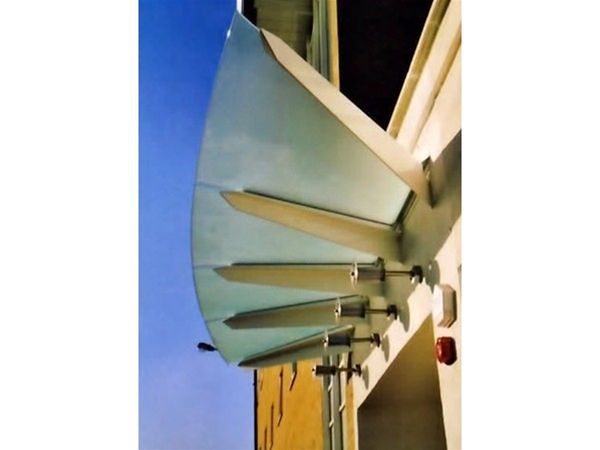 A fully decorated mild steel support framework fixed back to internal steel work with flat glass panels. The roof covering was provided by the use of satinised toughened safety glass panels fixed in a stainless steel planar type system. Panels were specifically shaped to form a true front edge curve to the canopy. All steel work was fully decorated using our standard heavy duty exterior grade enamel paint system, which is available in any standard BS or RAL colour.