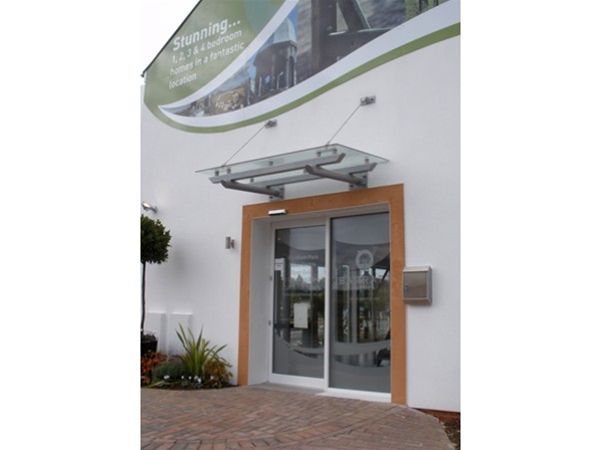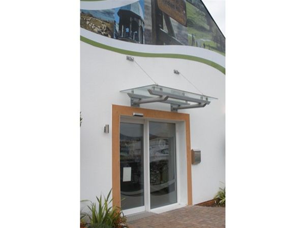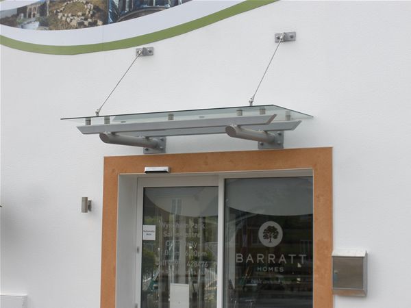 A simple but effective decorated mild steel canopy unit with toughened safety glass glazing on planar type fixings and with extra tension wire support rods.