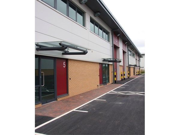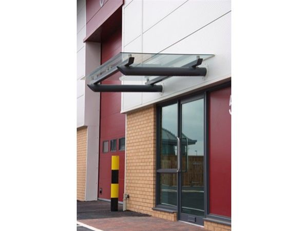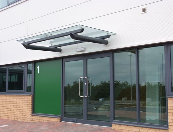 An economical solution to a requirement for numerous matching office entrance canopies. A mild steel fully decorated sub frame fixed back to internal steelwork supporting glass roof panels of clear toughened safety glass on a stainless steel planar type arrangement. Canopies sloped slightly forward to avoid the need for any drainage system. All steelwork was fully decorated using a metallic high build enamel paint system and all glass to glass joints were sealed using a clear Dow Corning silicon sealant.