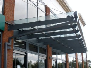 A traditional and economical solution to the requirements for a functional running feature canopy. A mild steel framework with laser profiled support arms fixed back to the main internal steel structure all fully decorated using a heavy duty exterior grade high gloss enamel paint system. Glazing to the roof area is by the use of clear toughened safety glass panels held in place using stainless steel planar type fixing arrangements. Extra stability is provided by the use of stainless steel tie rods fixed to the front edge of the canopy and to internal steelwork on the structure at a higher level. An integral front gutter channel with suitable down pipe completes the design.