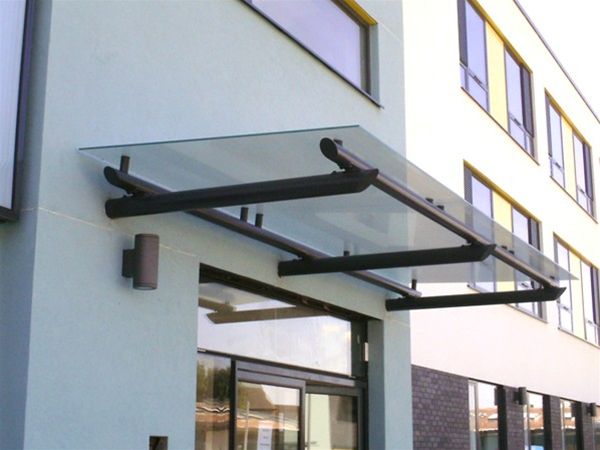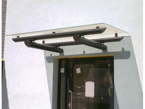 A simple CHS decorated framed canopy unit with singular toughened safety glass panel supported above the framework using stainless steel planar type fixings. The canopy sloped gently forwards to assist with rainwater dispersal and avoid the need for a rear gutter channel. The project involved several similar units on a large industrial estate.