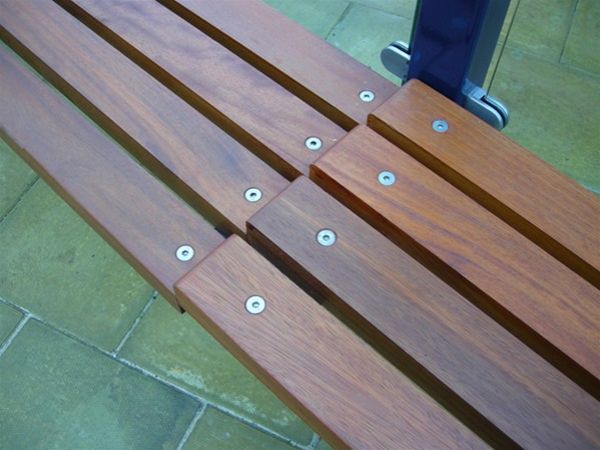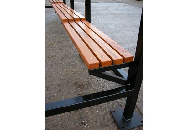 A typical running perch seat arrangement shown here on a traditional shelter unit. Timber rails are a renewable timber Iroko material, fixed in place throughout using anti vandal fixings. Seat can be fixed to steel framework in a variety of widths and configurations.