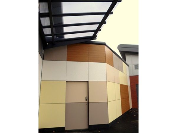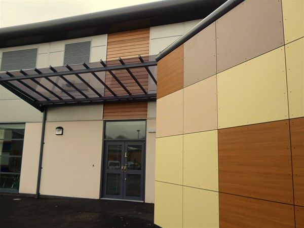 A Complete scheme provided by Urban Design comprised of a series of Glazed Entrance canopies, cycle storage units, extensive Trespa Cladding panel works. The cladding is a unique arrangement fixed on an internal steel frame support wall to provide a decorative separating barrier to the external facing walls of a mental health clinic. The walls also had integral Trespa Cladding doors, and a patent glazed canopy unit to the entrance area along with a cycle shelter.