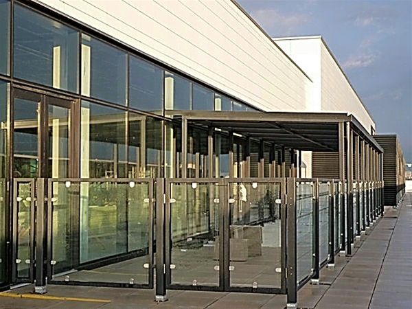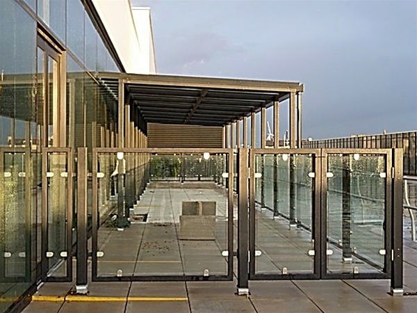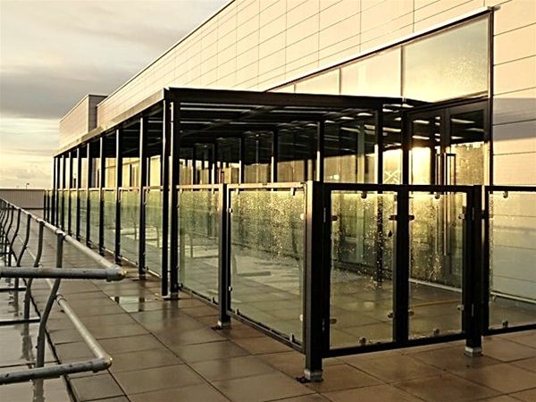 When a major UK casino wanted a large patio covering for use as a smoking area they approached Urban Design to create an enclosed area in accordance with current regulations. The cover to the shelter was created using a mild steel support frame, toughened safety glass and an aluminium polyester powder coated patent glazing system. A front running gutter channel with suitable down-pipes gave drainage to the structure. To the perimeter of the patio area a mid height glass and steel barrier rail was provided – see railings section for details.