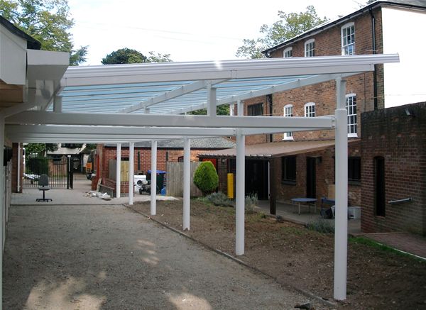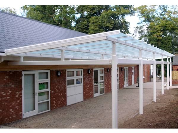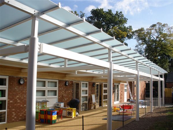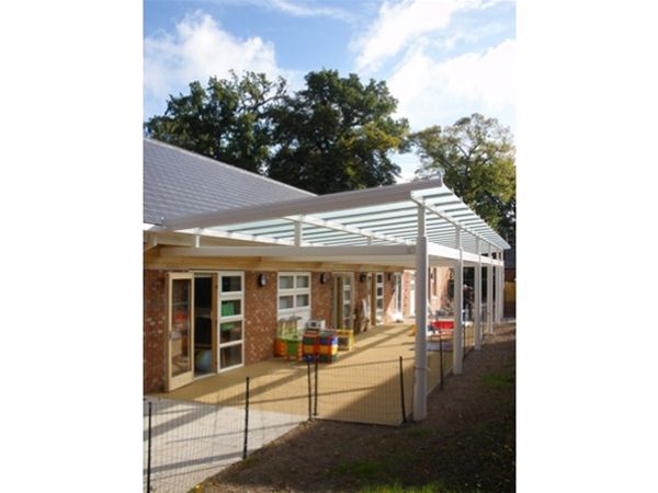 A mild steel decorated framework in an exterior grade heavy duty enamel high gloss paint system forming a mono pitch canopy which also acts as a play area cover. Support columns were taken to concrete foundation bases for fixing below ground level with horizontal members fixed back to the main structure for extra support. The roof area was covered with satinised toughened safety glass panels supported using a aluminium polyester powder coated patent glazing bar system. A rear gutter channel with suitable down pipes completed the project.
