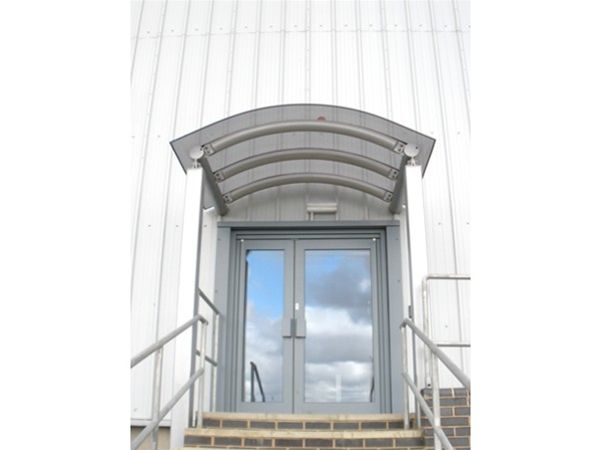 An economical staff entrance canopy fabricated with a decorated mild steel frame with curved roof members and a solid polycarbonate roof sheet covering, fixed securely in place using aluminium glazing straps and neoprene seals. All steelwork was decorated using a heavy duty exterior grade enamel gloss paint system.