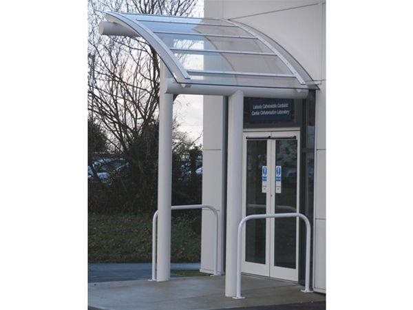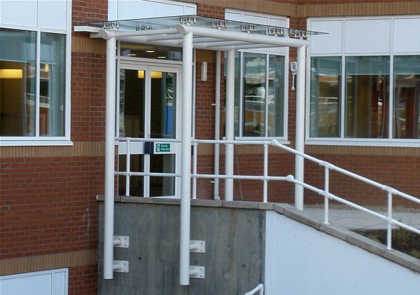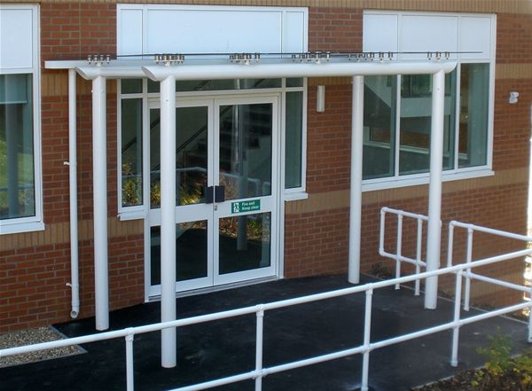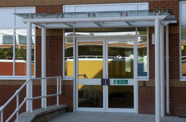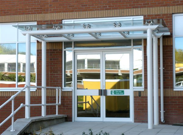 A supported canopy fixed to concrete side walls, due to the limited space and underground services. All glazing was of clear, toughened safety glass panels. All steelwork was decorated using an exterior grade heavy duty high gloss enamel paint system. Glazing panels both vertical and horizontal were supported from the main framework by the use of stainless steel planar type fixing brackets. An integral rear gutter channel with outlets completed the design.