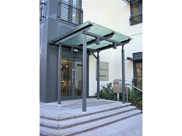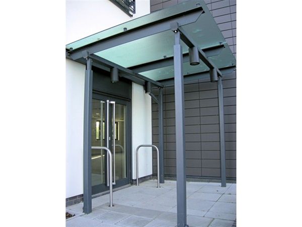 Comprising of a fully decorated mild steel framework complete with CHS support columns taken down to concrete foundations below ground level. All steelwork was fully decorated using our standard heavy duty exterior grade enamel paint system, which is available in any standard BS or RAL colour. Roof covering was provided by the use of satinised toughened safety glass panels fixed in a stainless steel planar type system. A rear integral aluminium gutter channel with suitable down pipes completed the design.