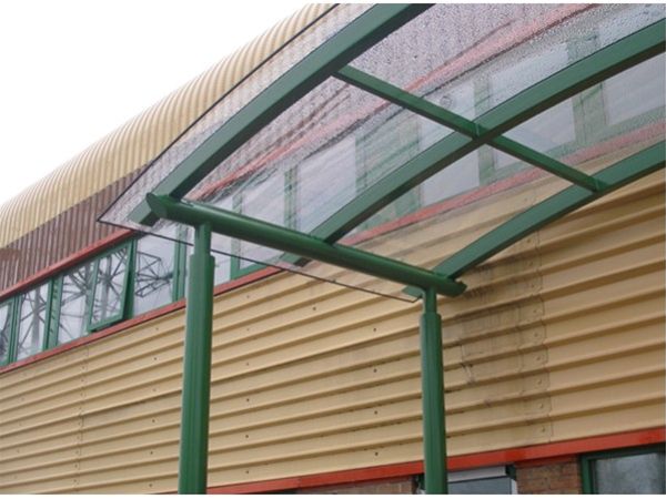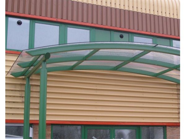 Comprising of a fully decorated mild steel framework complete with CHS support columns taken down to concrete foundations below ground level. All steelwork was fully decorated using our standard heavy duty exterior grade enamel paint system, which is available in any standard BS or RAL colour. Roof covering was provided by the use of clear solid polycarbonate sheeting panels fixed to the curved rolled roof members with aluminium clamping straps and gaskets.
